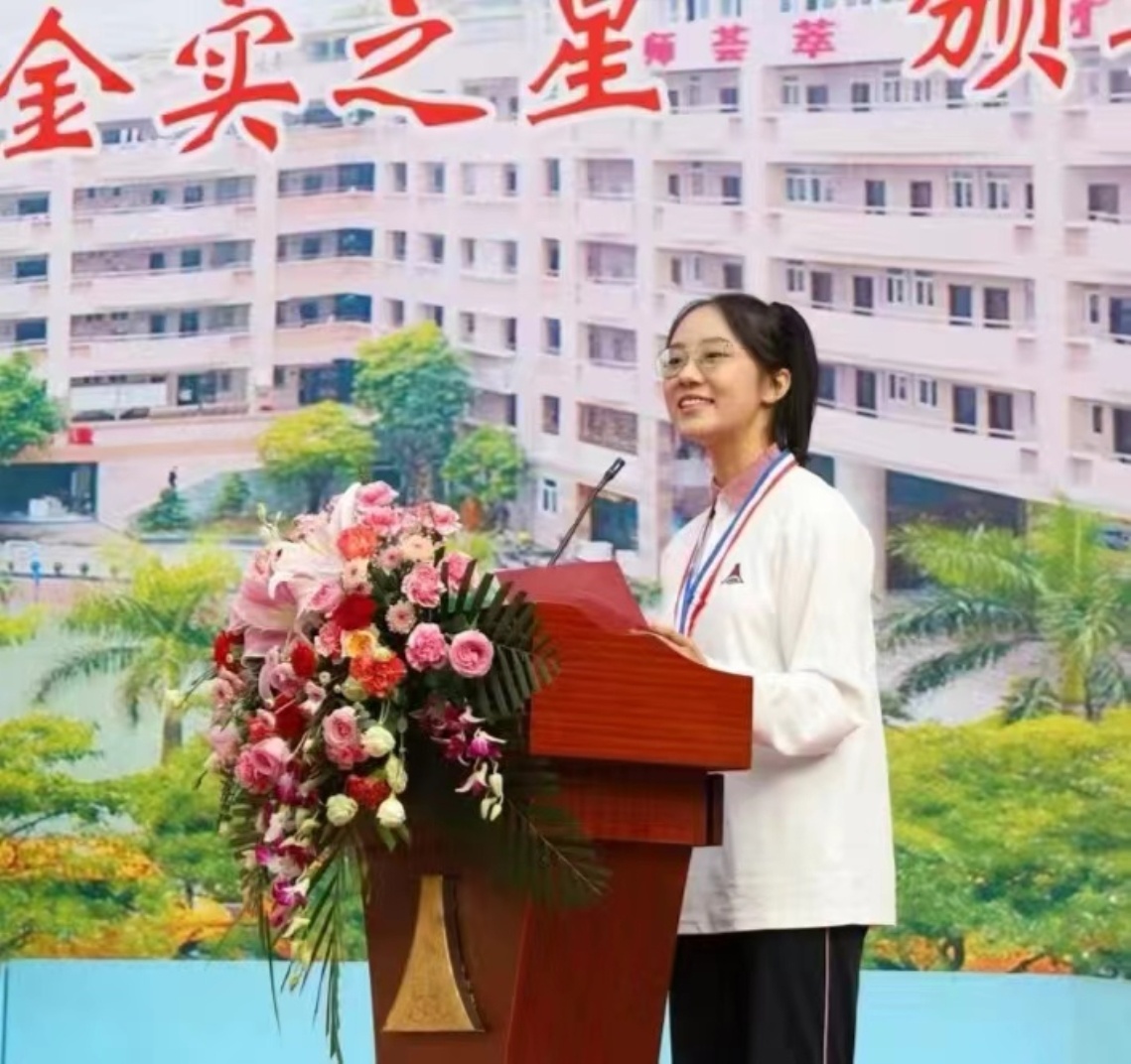 她热爱钻研数学,提前学习高中大学数学知识,励志将来成为一名科研人员,为国家科学发展做贡献。她树立科学精神,培养实践创新能力,自主查阅资料,编写数学建模论文,在2023年第十五届中学生数理化综合实践活动中,获国家数学论文二等奖、全国创新实践能力一等奖,广东省数学论文一等奖。