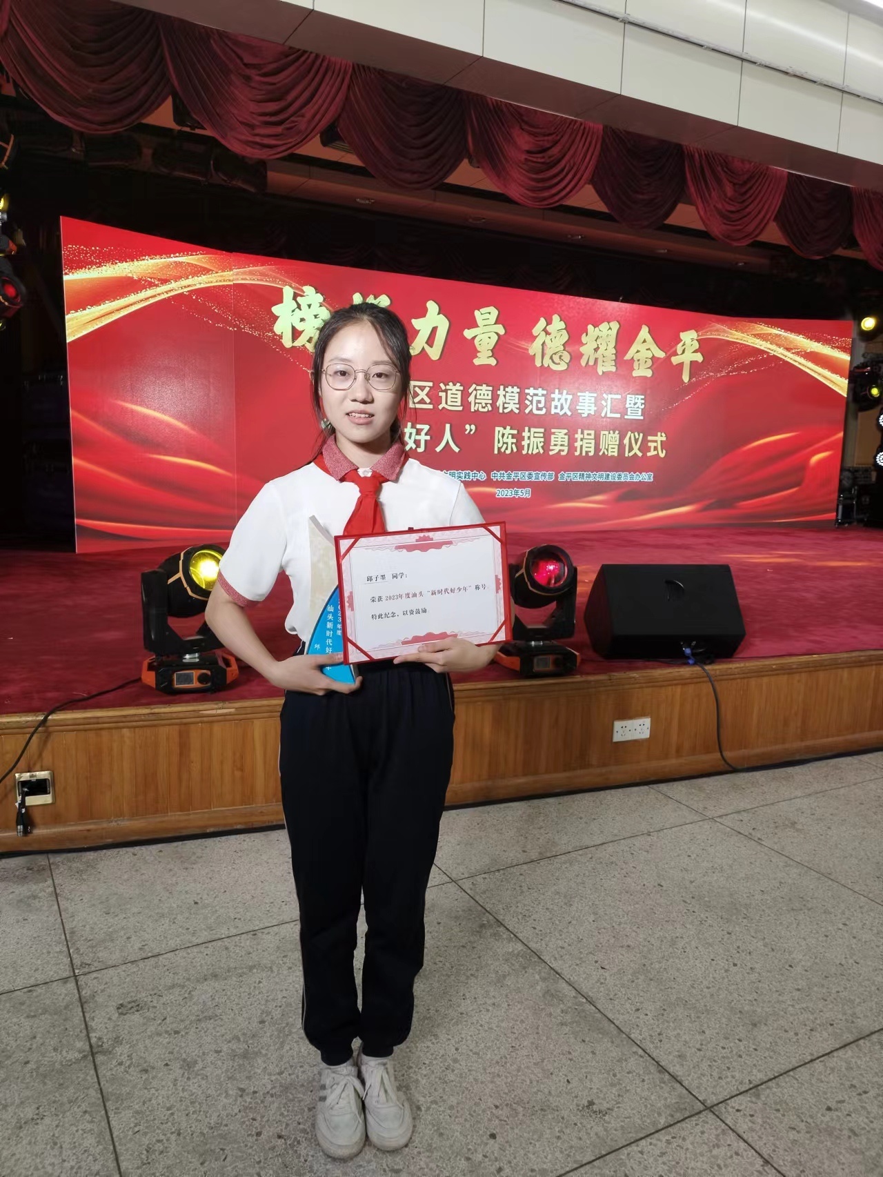 她热爱语言和文学创作,参加“广厦杯”灯谜比赛、文章《未尽之戯》描绘汕头传统铁枝木偶戏的故事,登上校刊《我们》;文章《少年强则国强》书写红色读后感,在书香满溢 喜阅连年”——汕头市2022年“4.23世界读书日”活动中获初中组三等奖,她用文字表达真挚情感,传递着青年情怀。
